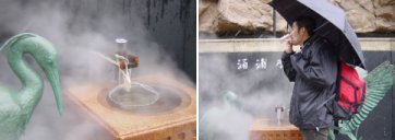 体が冷えてきたので,酒屋に行って熱澗を探したのですが,見当たりません. しかし,ここは温泉街.温泉が湧き出しているではありませんか.それを使って熱澗を作ることにしました. 湧き出ている温泉は本来飲んだり温泉卵を作ったりするためのようですが,かなりの高温で, 数分間酒瓶を付けていると良い具合に熱澗ができあがりました.