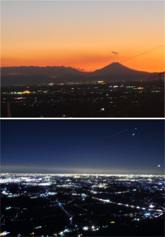 冬になると視界が冴え渡ることから筑波山ではスターダストつくばといって,土日の夜もロープウェイを営業しています.筑波山から見る夜景.視界がよいときには遥か東京タワーまでが見えるといいます. 天気がよくて,寒くて,風が強い日.視界が冴えるための条件です.去年あたりからそんな土日をずっと狙っていたのですが,とうとう来ました.昼間にも筑波山がくっきりと見えます.夜の視界も冴えているに違いないと思い,車を走らせました. 日没にあわせていったのですが,途中で夕焼けをバックに富士山が見えました.この段階で筑波山の頂上にまで行ければよかったのですが,残念ながら間に合わず….急勾配の山道を走っている途中で車を止めて写真だけパチリと写しました.右上の写真です.夕焼けが綺麗に見える時間はものの数分で,峠を一つ二つ越えると,もう太陽は完全に沈んでしまいました. そしてロープウェーにのって頂上へ.係員の方が今日は今年一番の景色が見える日だとのアナウンス.見事に狙い通りでした.豆粒のようではありますが,東京タワーが小さな赤い三角形として光っていました.筑波山からの夜景が普通の夜景と違うところは,近くは暗いのですが,遥か彼方が東京の光で皓々と輝いている点です. 右下の写真はシャッター速度をかなり遅くしたので,少々大げさに写ってはいますが,この通り正に絶景でした. (2008/11/30) |